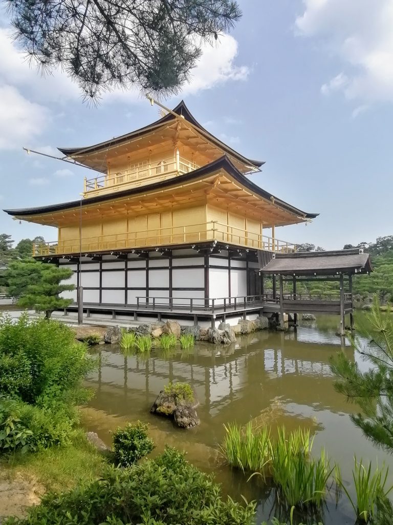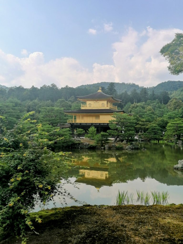 Die zwei obersten Stockwerke des Kinkakuji (金閣寺) sind vollständig mit Blattgold überzogen, weshalb der Tempel auch den Namen „Goldener Pavillon“ trägt. Ursprünglich war die Anlage im Nordwesten Kyotos der Alterswohnsitz von Shogun Ashikaga Yoshimitsu (1358-1408). Der aktuelle Bau ist jedoch sehr viel jünger, da die Gebäude im Laufe ihrer Geschichte häufig abgebrannt sind. Zuletzt geschah dies am 2. Juli 1950, als der Tempel Opfer eines Brandanschlags wurde.
