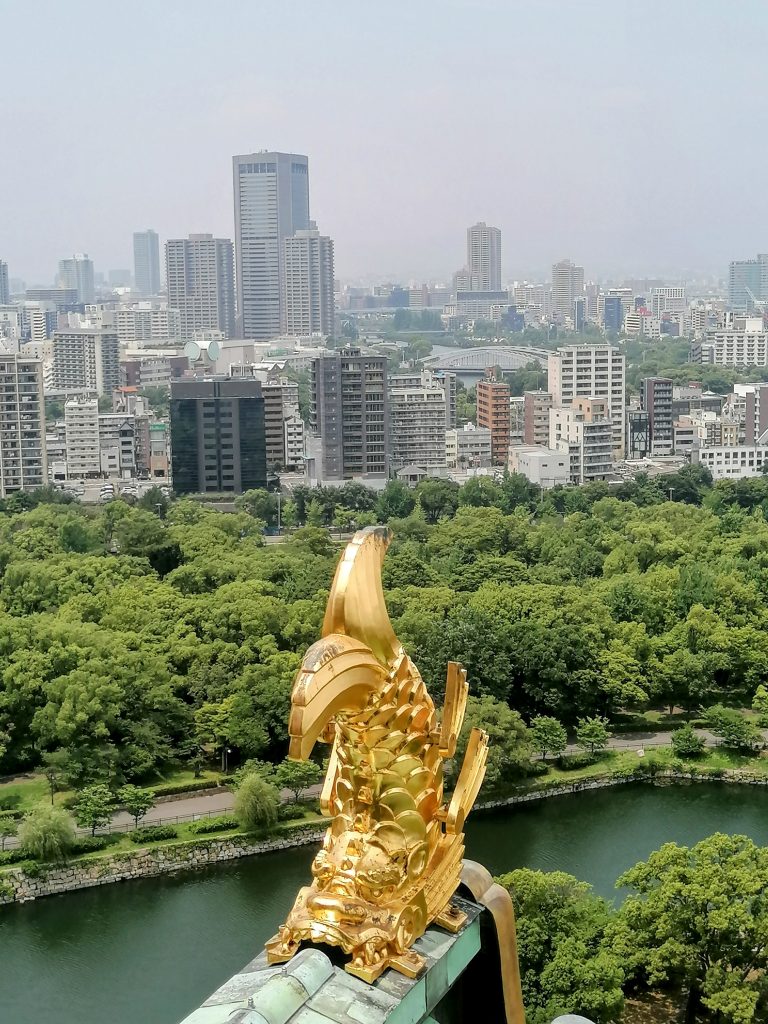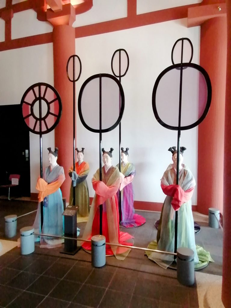 Besonders eindrucksvoll ist die Teilrekonstruktion der Eintrittshalle des Naniwa Palasts aus der Nara Periode (710-794 n.Chr.). Hier kann man die Hofdamen und Beamten betrachten, die in originalgetreuen Kleidern zum Herrscher eilen. Wechselt man von einem Stockwerk zum anderen, gelangt man in ein verglastes Treppenhaus, von dem man die Burg von Osaka in ganzer Pracht beobachten kann. Allein diese Aussicht wäre es schon wert die 3,45€ für den Eintritt auszugeben.