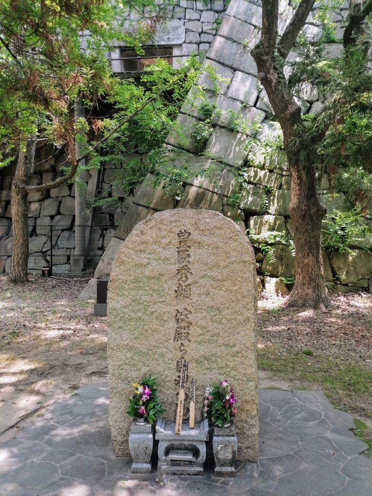 Nähert man sich dem Hauptturm aus nördlicher Richtung, so läuft man an den Gräbern von Toyotomi Hideyori, dem Sohn des Burggründers, sowie dessen Frau Yodo-dono vorbei. Nach dem Tod des Reichseinigers Hideyoshi, sollte dessen junger Sohn Hideyori den Thron übernehmen. Jedoch wurde er schnell von dem aggressiven Daimyo Tokugawa Ieyasu verdrängt. Nach der Belagerung von Osaka zwang der neue Regent den Sohn Hideyori mitsamt seiner Mutter, der verwitweten Frau des Reichseinigers, an diesem Ort Selbstmord zu begehen. Damit begann das Tokugawa Shogunat (Edo-Zeit), welches noch bis 1868 Bestand haben sollte.