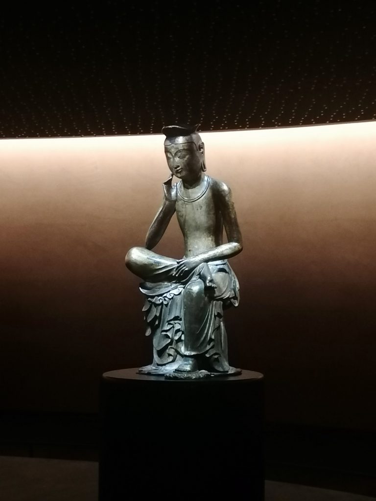 Eine der Hauptattraktionen des Nationalmuseums in Seoul ist der kontemplativ, nachdenklich, in sich gekehrte Buddha. Dabei handelt es sich um vergoldete Bronzeskulptur, die mit halbgekreuzten Beinen sitzt und grübelnd die Hand an die Backe anlegt. Der Vergleich zu Rodins Skulptur „Der Denker“ drängt sich geradezu auf.