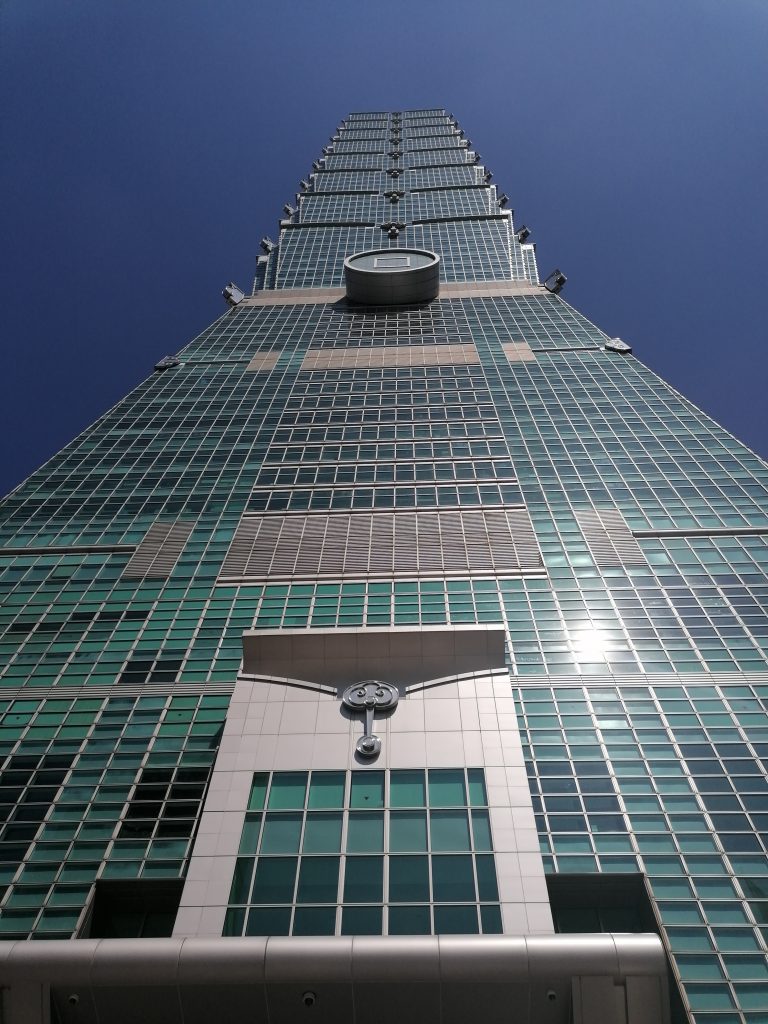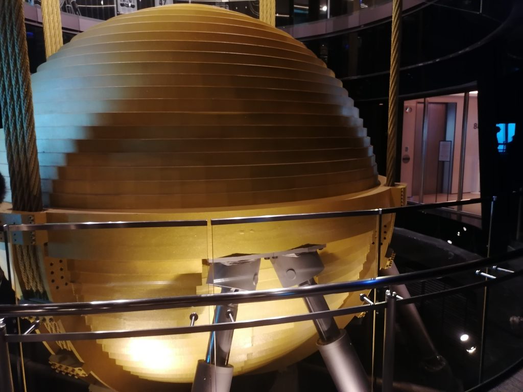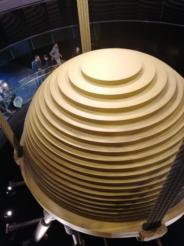 Nun befindet sich Taiwan in einem Erdbebengebiet und wird regelmäßig von Taifunen heimgesucht. Deshalb wurde im obersten Segment des Turms, zwischen dem 87. und 92. Stockwerk eine 660 Tonnen schwere Stahlkugel angebracht. Sie hat einen Durchmesser von etwa 5,5 Meter, kann sich ca. einen Meter von einer Seite zur anderen bewegen. Lustig wie ein Pendel, Symbol für Ausgleich, Harmonie und Streben nach Gleichgewicht, auch hier für stabile Verhältnisse sorgt.