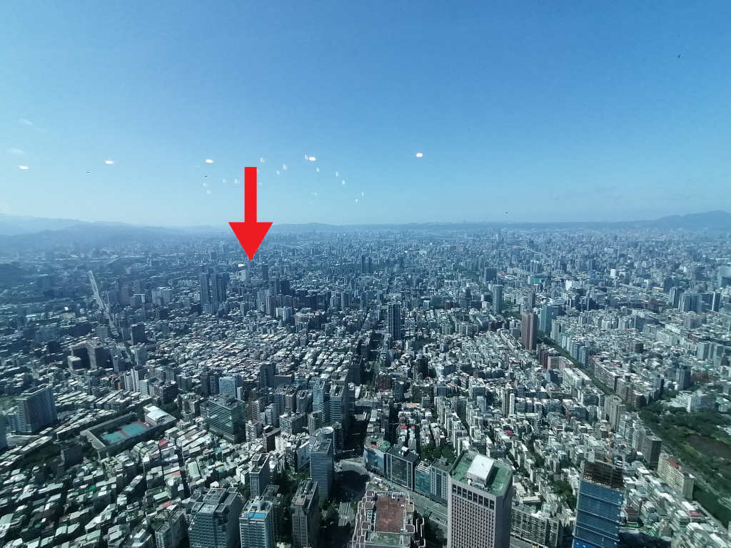 Auf dem 89. Stock befindet sich dann die Aussichtsplattform, die relativ groß ist und an Disneyland erinnert. Hier kann man Souvenirs kaufen (erschreckenderweise keine Bücher zur Konstruktion des Turms!), Kaffee trinken und sogar mit Maskottchen Fotos schießen. Die Aussicht reicht über die ganze Stadt, sodass ich sogar mein Wohngebäude von dort oben entdecken konnte (markiert durch den roten Pfeil).