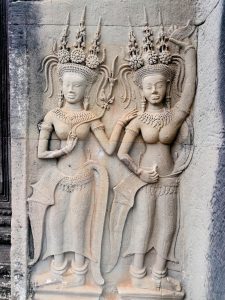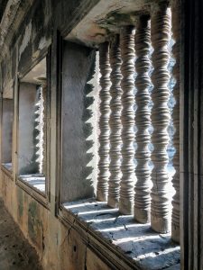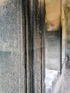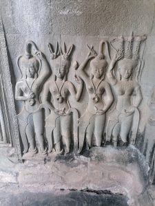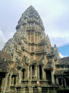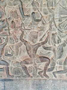 Der Tempel von Ankor Wat selbst ist eine Pyramide mit drei Ebenen, die jeweils von einer Mauer umgeben sind und über mehrere Türme verfügen. Auf dem obersten Stockwerk (Bild 7) stehen vier Türme für die jeweiligen Himmelsrichtungen und der höchste, fünfte Turm (Bild 8) steht in der Mitte. Die Türme sind also angeordnet wie die schwarzen Punkte auf einem Würfel, der die fünf zeigt. Die Ummauerungen der drei Stockwerke ist mit wunderschönen Wandreliefs verziert, die die Geschichte der Khmer erzählen und viele Mythen aus dem indischen Heldenepos Ramayana abbildet.