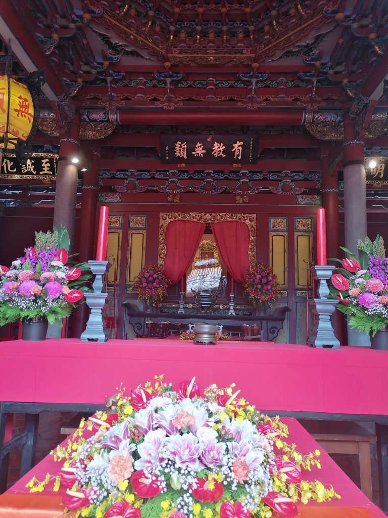 In der Haupthalle über den Schriftzeichen für Konfuzius steht: you jiao bu lei 有教無類. In der Lehre gibt es keine Unterschiede (in der sozialen Klasse). Weil Konfuzius der erste war, der die Menschen unabhängig von ihrer Herkunft unterrichtet hat, gilt er heute als „erster Lehrer“.