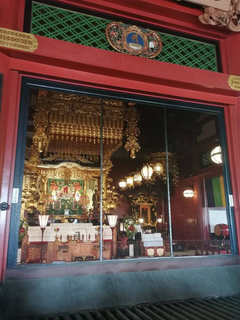 Nähert man sich dem Sensoji-Tempel so läuft man zunächst durch das Kaminari-mon, das Donnertor, was auch auf der Laterne steht (chin.: leimen 雷門). Diese riesige rote Papierlaterne ist ca. 3,9 m hoch und wiegt ca. 700 kg. Auch hier befinden sich rechts und links zwei mächtige Nio-Statuen! Anschließend folgt eine kleine Einkaufsstraße für allerlei Nippes, die sogenannte Nakamise-dōri. Dann läuft man auf ein weiteres Tor zu, dem Hozo-mon, hinter dem sich ein Brunnen zur Reinigung und einen Schrank für Wahrsagersprüche befindet. Erst zum Schluss erreicht man die Haupthalle mit der goldenen Guanyin-Statue.