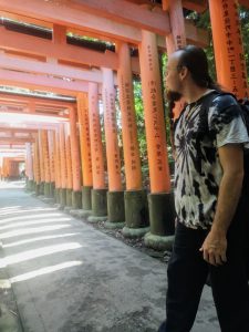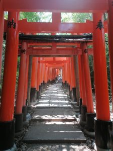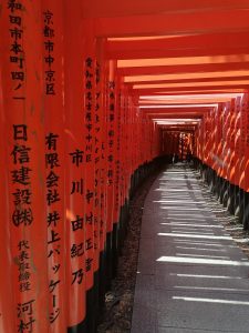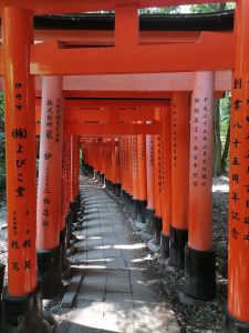 Der Fushimi Inari Schrein ist vor allem aufgrund seiner Alleen aus Tausenden von orange-roten Torii-Toren bekannt. Diese Tore werden meist von Privatpersonen oder Unternehmen gestiftet, oft als Dank für geschäftlichen Erfolg. Das Durchschreiten der Torii wird als spirituelle Reinigung und als Übergang in eine heilige Sphäre empfunden. So kann man auf verschiedenen Pilgerwegen stundenlange Wanderungen unternehmen, vorbei an kleineren Schreinen, Statuen von sogenannten Fuchswächtern und ruhigen Lichtungen.