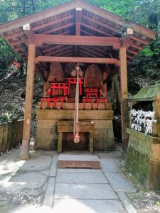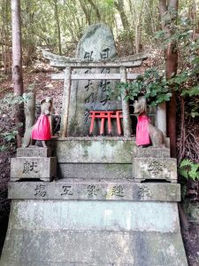 Der Schrein ist der shintoistischen Gottheit Inari gewidmet, der Göttin der Landwirtschaft und des Getreides, vor allem aber des Reises. Der Legende nach treibt sie sich immer wieder in Form von Füchsen auf der Welt herum, die deshalb auch als ihre Schutzpatronen gelten. Im weiteren Sinne ist Inari aber auch als Göttin des Wohlstands im Allgemeinen. Oft werden die Füchse mit rotem Lätzchen und mit Dharma-Schlüssel oder Wunsch-Juwel im Maul dargestellt.