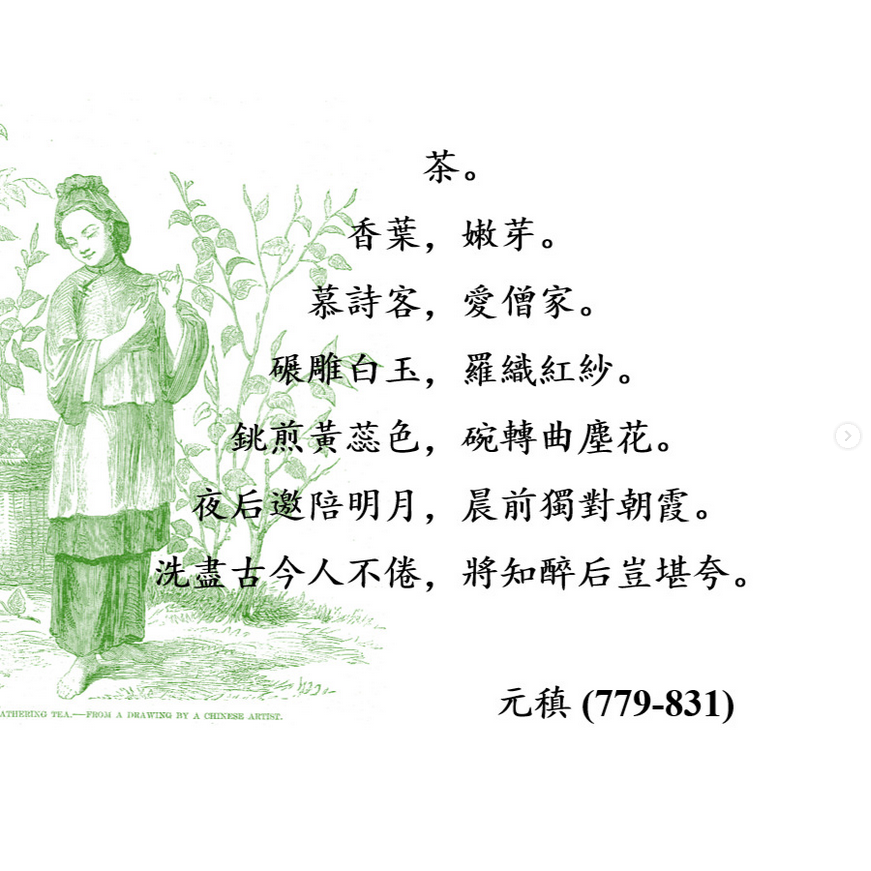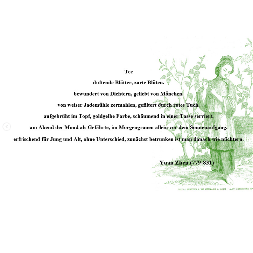 Dieses berühmte Teegedicht stammt von dem tangzeitlichen Poeten Yuan Zhen (元稹), der von 779 bis 831 lebte. Das Schriftbild des Gedichts ähnelt dabei einer Pagode, mit jedem Vers wird es um ein Schriftzeichen und damit einer Silbe länger. Bei meiner Übersetzung habe ich versucht den Effekt dadurch nachzustellen, dass mit jeder Zeile die Anzahl der Worte zunimmt.