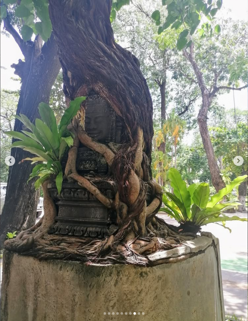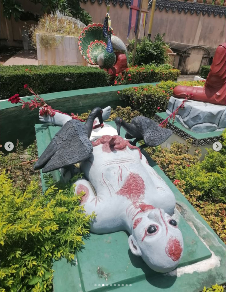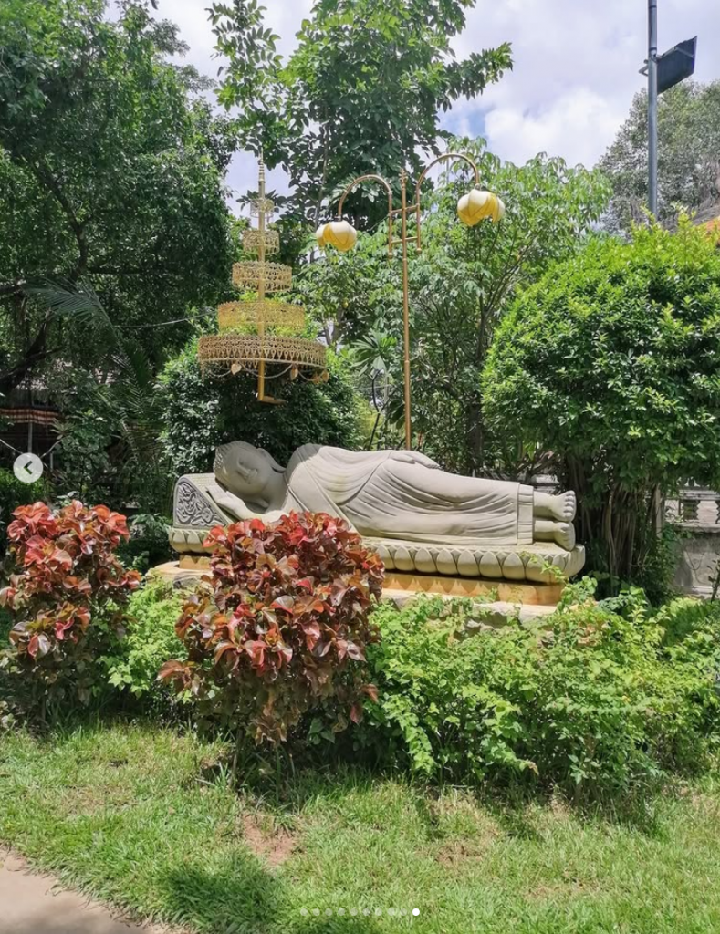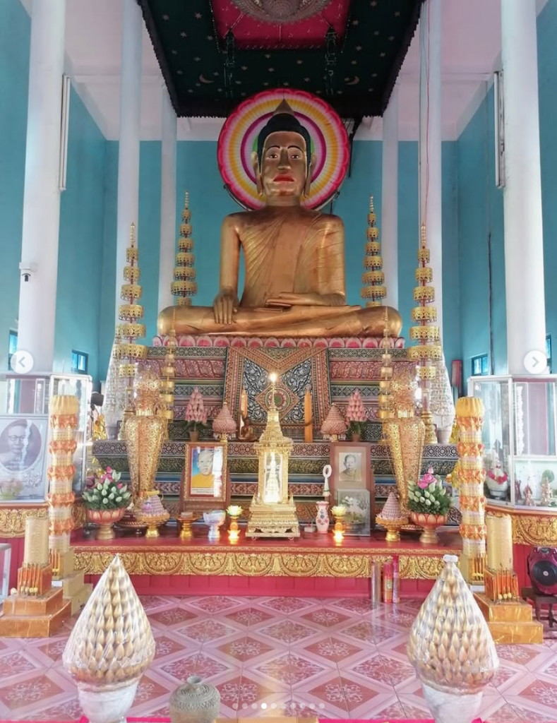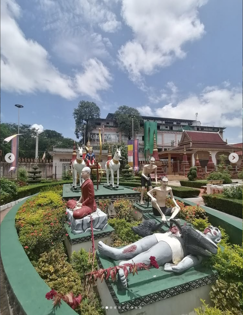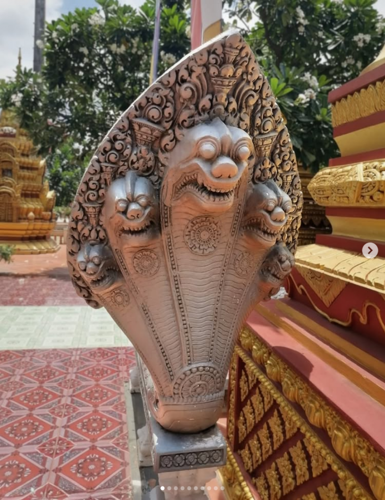 Da wäre z.B. ein buddhistischer Tempel namens „Wat Preah Prom Rath“ mit seinen, teilweise recht grauenvollen Plastiken. Statuen von Aasgeier, die die Eingeweide der Verstorbenen fressen sowie von halbverhungerter Wandermönche befinden sich gleich am Eingang. Dahinter die Haupthalle mit der vergoldeten Statue des sitzenden Buddhas. Neben dem Tempel selbst befindet sich auch noch ein Kloster und eine Schule auf dem Gelände. Wie auch in den meisten anderen Tempeln in Kambodscha, findet man auch hier Statuen der finster dreinblickenden Naga. Dabei handelt es sich um eine Schlangengottheit aus der indischen Mythologie, die als Wächterin von Brücken, Übergängen, Türen, etc. gilt. Manchmal werden sie als halb menschlich halb Schlange dargestellt, hier aber sehen sie aus wie eine Kobra mit mehreren Köpfen. Obwohl die Gottheit indischen Ursprungs ist, hat sich ihre Anbetung in ganz Südostasien verbreitet.